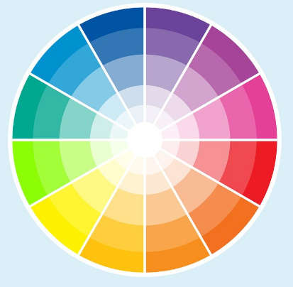 The colour wheel is a visual representation of how the three primary colours are mixed with one another to create secondary and tertiary colours, along with how white will affect varying tones of the same colour.