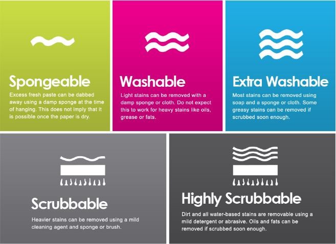 These range from ‘spongeable’ (only dab fresh paste off when hanging the paper when it’s still wet), to ‘highly scrubbable’ (scrub using mild detergents to remove oils and other tough stains). For more details about ‘washability’ and ‘scrubbability’ head to I Want Wallpaper’s wallpaper symbols guide.
