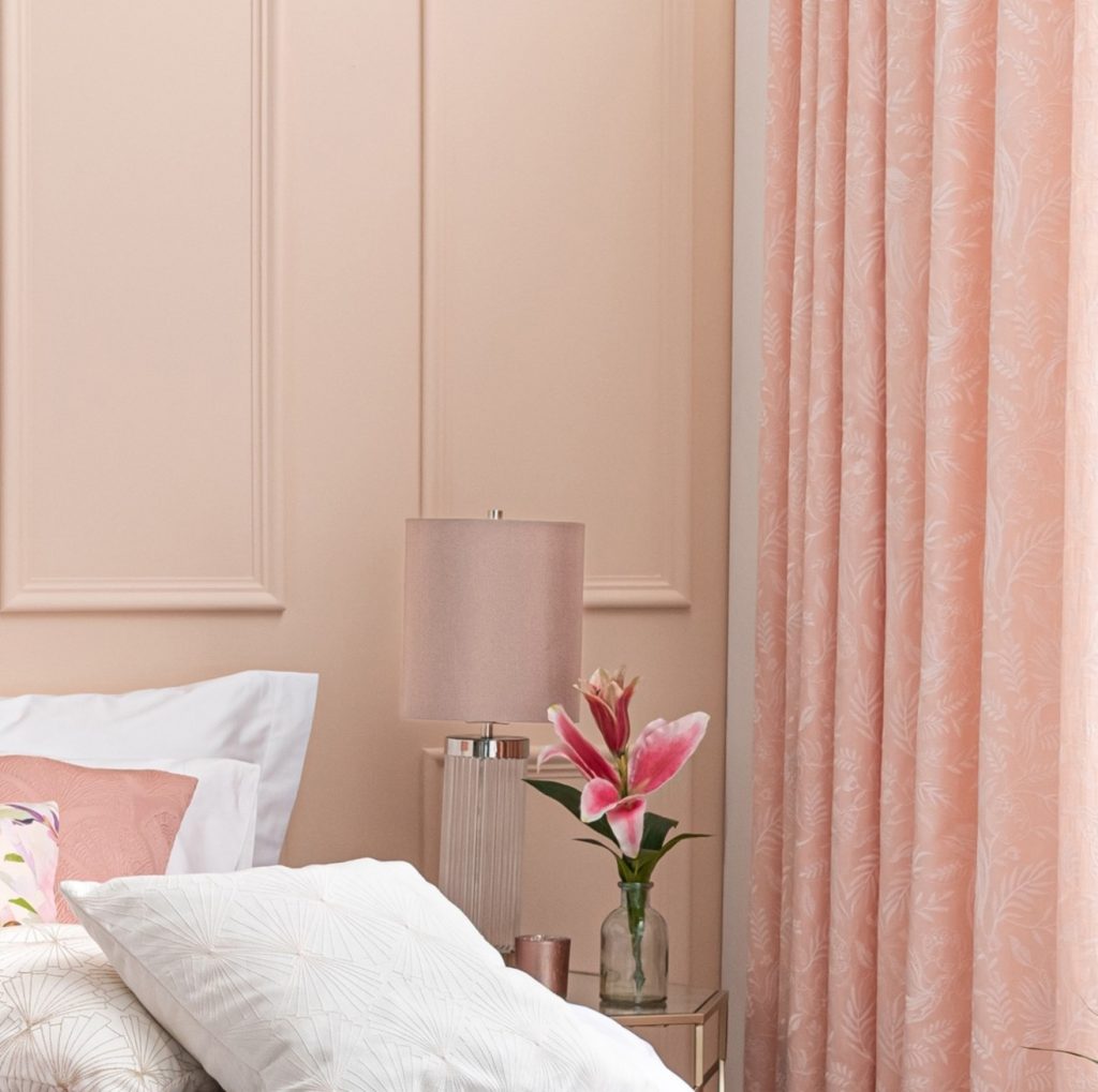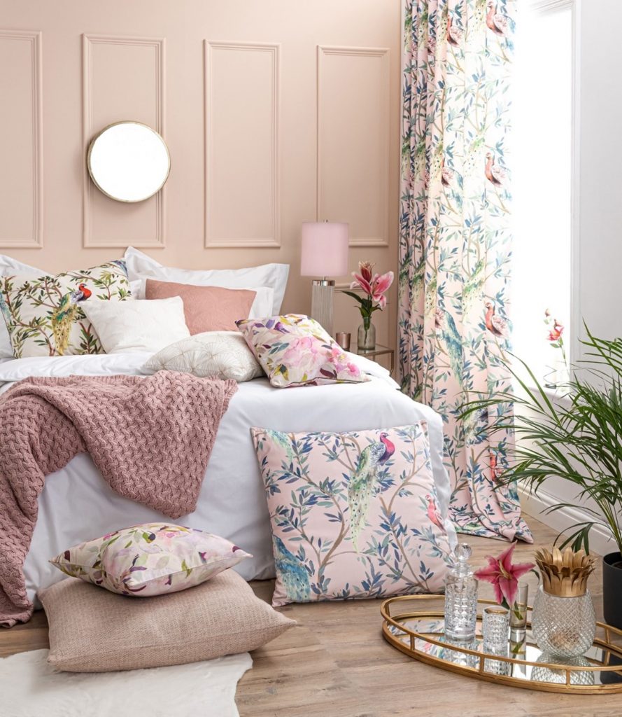 If a bold block of pink is too much for you, opt for patterned accessories that will break up the colour and add interest and depth. We love our bold peacock curtain fabric design that brings in lots colour set on a gorgeous blush background, or if you want something more subtle – the white leaf motif also has the same effect (see picture two). Using the same fabric for your cushions is a great way to add a designer finishing touch to your room. We love how the final look of these rooms is elegant and whimsical without being sickly sweet.
