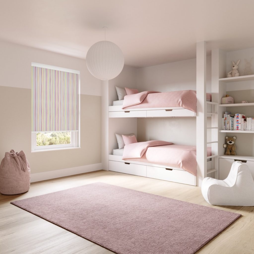 Adding colour into your home doesn’t mean that you have to completely re-decorate. Look at how you can enhance what you already have with some easy and cost effective updates. Duvet covers, rugs and window blinds can completely transform a room. We love the blush tones that have been used in this space and how they work to really make our candy stripe roller blind pop.