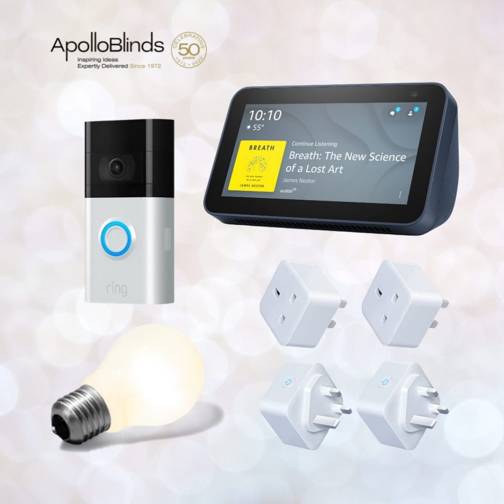 Our ‘golden prize’ is a Smart Home technology Bundle worth more than £300. It includes an Amazon Echo Show, a Ring doorbell, smart bulbs and a set of smart plugs that, just like our motorised blinds, can be operated with a smart phone or via voice control devices.