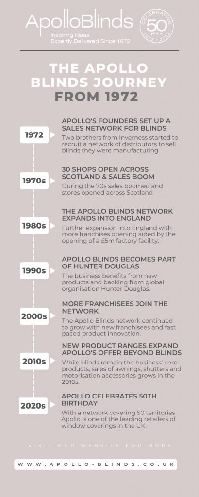 Apollo Blinds began in 1972 when two brothers from Inverness started to recruit a network of distributors to sell the blinds they were manufacturing.