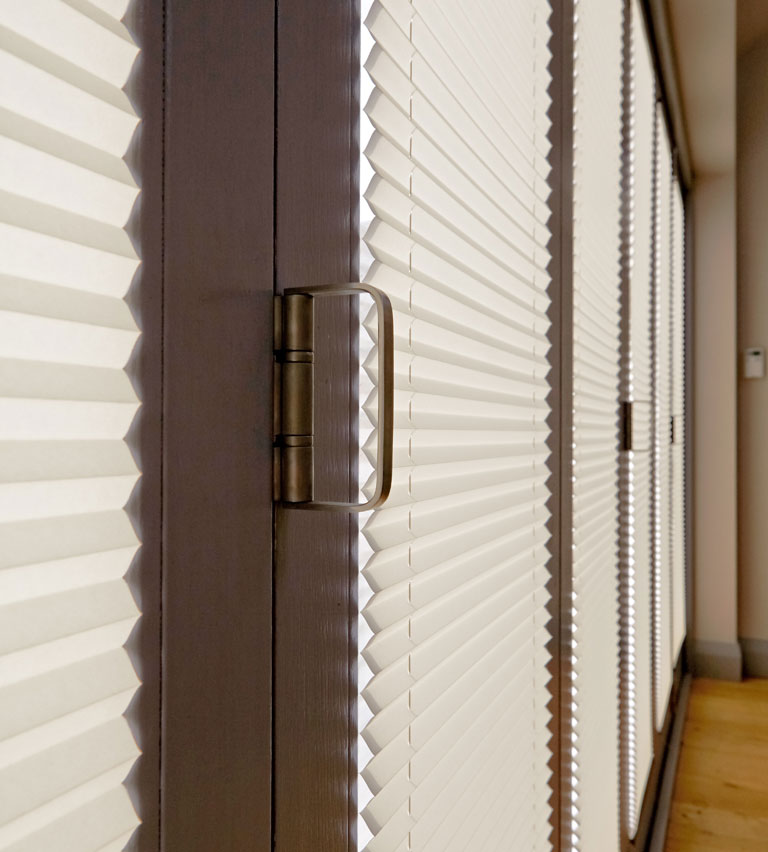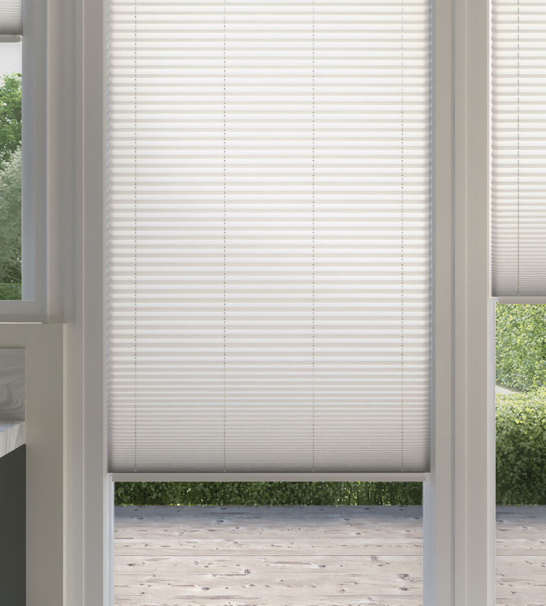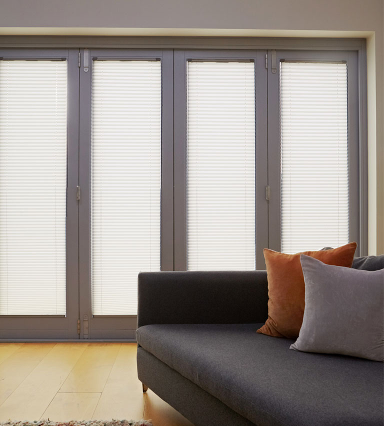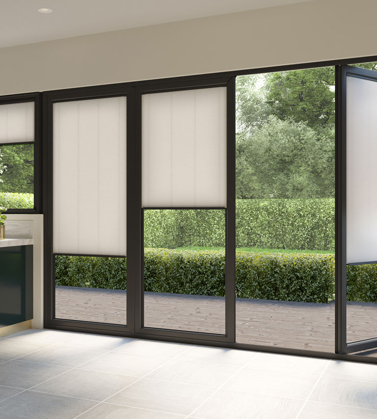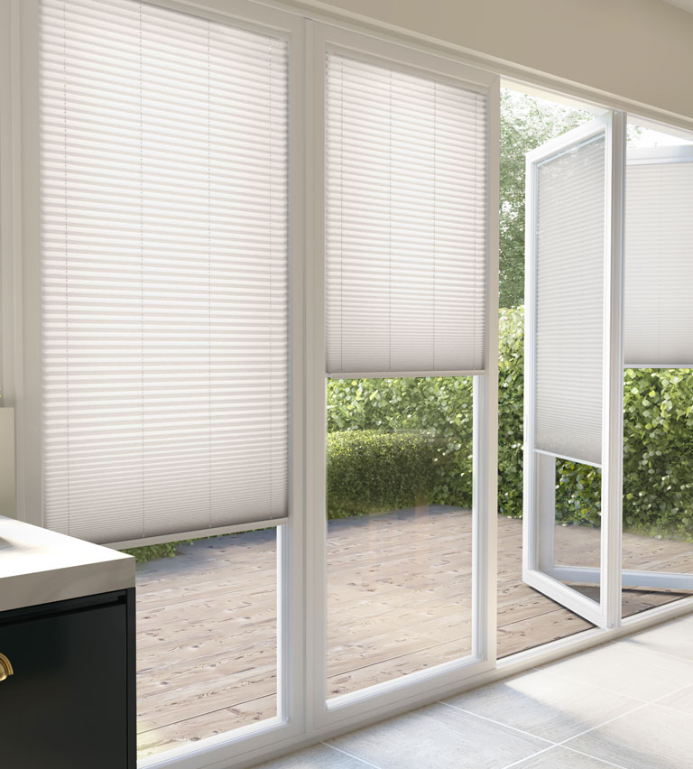Bespoke 16 mm pleated and 18 mm cellular fabrics fit within the reveals of bi-fold doors, so this system can be used on PVC, wooden or aluminium doors and windows.